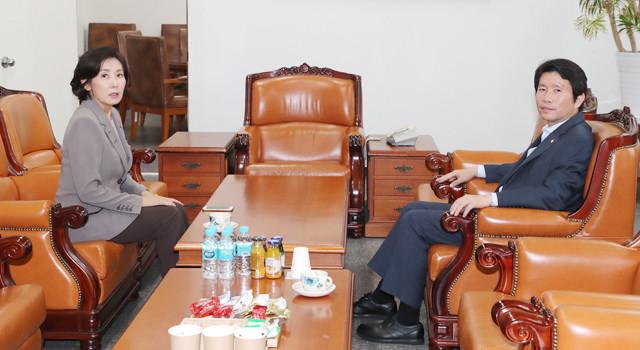 이인영 원내대표(오른쪽) 자유한국당 나경원 원내대표가 4 오후 국회 운영위원장실에서 조국 법무부 장관 후보자 인사청문회와 관련해 회동하고 있다.
