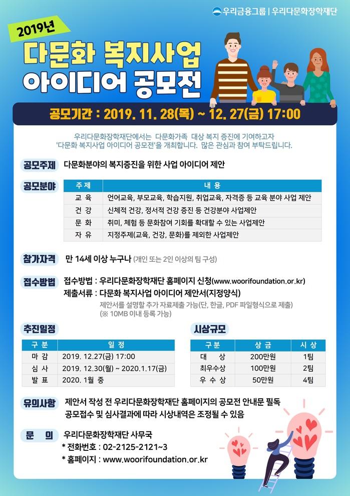 [시민일보 = 황혜빈 기자] 우리금융그룹 우리다문화장학재단은 다문화가족의 복지증진에 기여하고자 ‘다문화 복지사업 아이디어 공모전’을 개최한다고 6일 밝혔다.