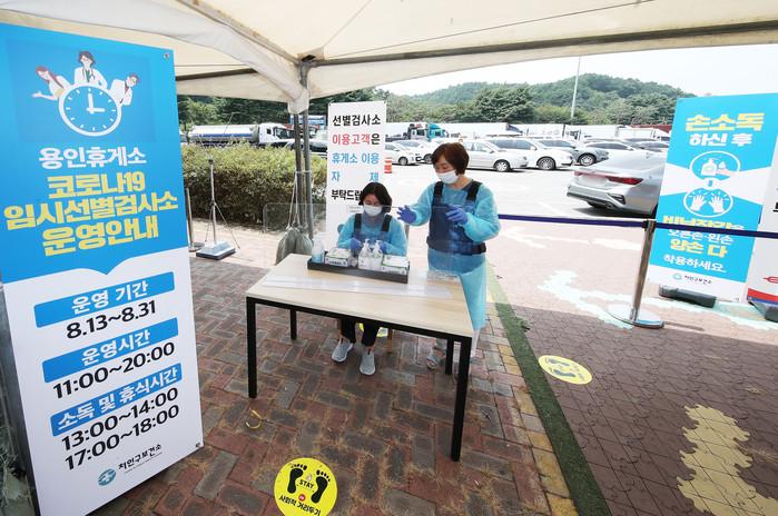 12일 경기도 용인시 영동고속도로 용인휴게소 인천방향에 설치된 임시선별검사소에서 처인구보건소 관계자들이 운영을 하루 앞두고 준비작업을 하고 있다. 정부는 본격적인 여름 휴가철을 맞아 국내 코로나19 확산 방지를 위해 오는 13일부터 31일까지 경부선 안성 휴게소(서울 방향), 중부선 이천 휴게소(하남 방향), 서해안선 화성휴게소(서울 방향), 영동선 용인 휴게소(인천 방향) 등 4곳에 임시선별검사소를 설치해 운영한다.
