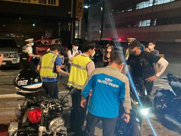 | ▲ 구청 직원 및 성동경찰서 경찰관이 성수동 일대 소음유발 이륜차를 단속하는 모습. (사진제공=성동구청) |