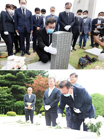 더불어민주당 대표 경선에 출마한 이낙연 의원이 21일 오후 광주 북구 운정동 국립 5.18민주묘지를 찾아 윤상원 열사 묘소를 참배하고 있다(위). 더불어민주당 대표 경선에 출마한 김부겸 전 의원이 21일 강원 태백시 산업 전사 위령탑에 분향하고 있다.