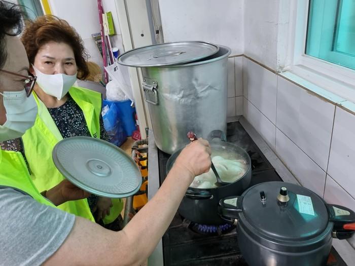 서울 도봉구 쌍문3동 자원봉사캠프는 최근 지역내 홀몸노인 등 취약계층 60여가구에 직접 만든 삼계탕을 전달했다. 이번 행사는 구에서 공모한 2021 자원봉사캠프 특화사업에 선정돼 예산을 마련했고, 대성교회에서 주방을 제공받아 진행됐다. 사진은 봉사자들이 삼계탕을 만들고 있는 모습. (사진제공=도봉구청)