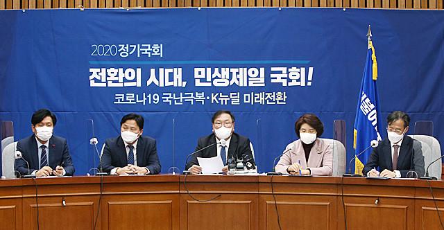 더불어민주당 김태년 원내대표가 3일 국회에서 열린 정책조정회의에서 발언하고 있다.