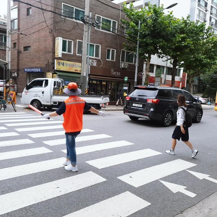 | ▲ 강동구 어린이 교통사고 다발지역 안전지킴이가 신호등이 없는 성대초등학교 통학로의 횡단보도에서 보행지도를 하고 있다.(사진제공=강동구청) |