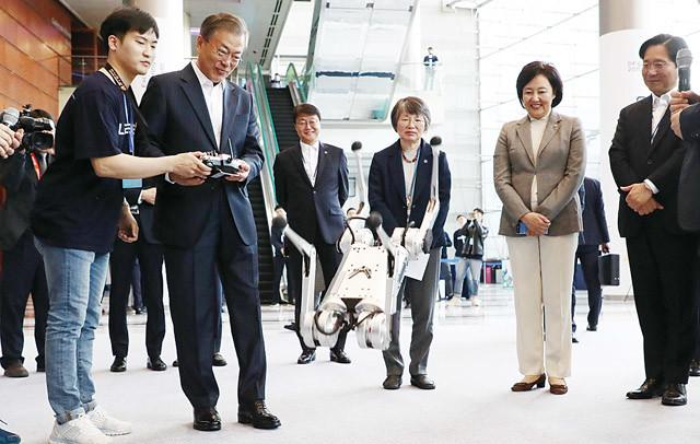 대통령이 28 오전 강남구 코엑스에서 열린 인공지능 콘퍼런스 ‘데뷰(DEVIEW) 2019’에서 리모컨으로 로봇 미니치타를 공중회전하고 있다. 로봇은 이번 행사에서 국내 최초로 공개됐다.