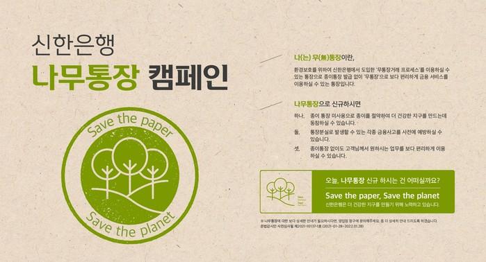 나무통장 캠페인은 나는 종이통장을 발급하지 않는다는 뜻의 ‘나(는) 無(무)통장’과 ‘종이 사용을 줄여 나무를 살리자’는 의미를 담았으며 올해 연말까지 진행된다.