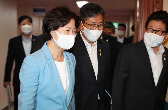추미애 법무부 장관(왼쪽)이 8일 정부서울청사에서 열린 국무회의에 참석하고 있다.