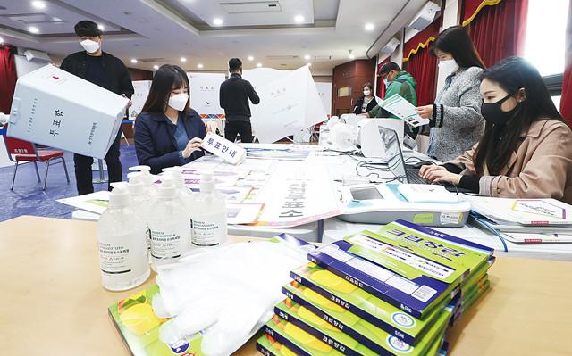 9일 오전 경기 수원시 장안구 조원2동 행정복지센터에서 공무원들이 제21대 국회의원선거 사전투표소 설치 작업을 하고 있다.