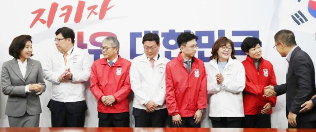 황교안 대표와 나경원 원내대표가 31 국회에서 열린 ‘제1 영입인재 환영식’에서 참석자들을 환영하고 있다. 왼쪽부터 원내대표, 윤창현 서울시립대 경영학부 교수, 김용하 순천향대 IT금융학과 교수, 김성원 두산중공업 부사장, 백경훈 청사진 공동대표,양금희 여성유권자연맹회장, 이진숙 대전MBC 대표이사 사장, 대표.