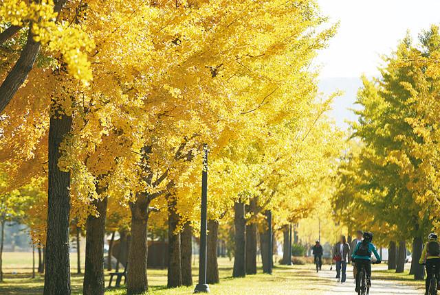 오전 경기도 여주시 강천섬을 찾은 시민들이 노랗게 물들어가는 은행나무길을 산책하며 깊어가는 가을을 느끼고 있다.