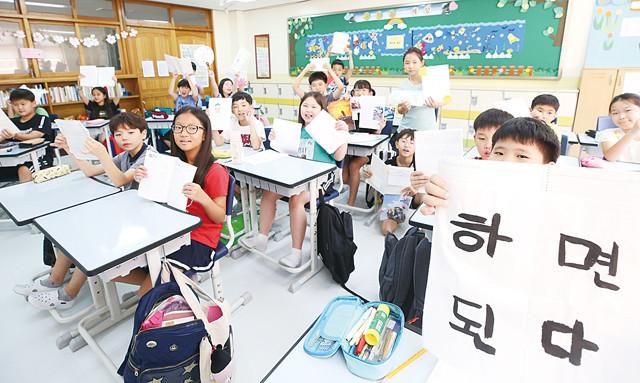 오전 여름방학을 마치고 개학한 경기 수원시 영통구 태장초등학교에서 4학년 학생들이 방학 숙제를 보여주고 있다.