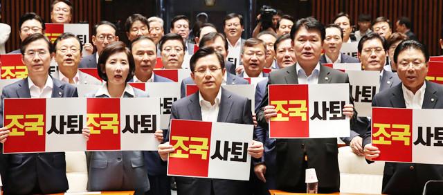 국회 예결위회의장에서 열린 자유한국당 의원총회에서 황교안 대표와 나경원 원내대표 참석자들이 ‘조국 사퇴’를 외치고 있다.