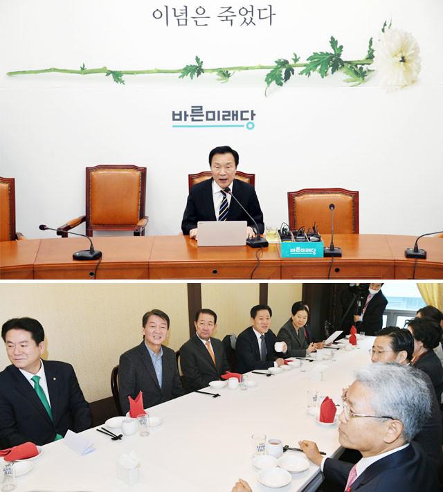 바른미래당 손학규 대표가 28일 국회에서 기자회견을 열고 입장을 밝히고 있다(위). 바른미래당 안철수 전 대표(왼쪽 두번째)가 28일 서울 여의도 한 음식점에서 바른미래당 의원들과 오찬회동하고 있다.