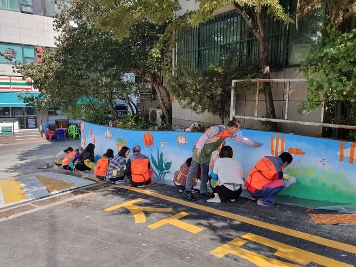 인천 연수구 옥련1동 행복마을공동체가 지난 30일 연수구 한나루로 158번길에서 ‘옥련1동 마을길 함께 가꾸기·벽화그리기 사업’을 진행했다. 사진은 참여자들이 벽화를 그리고 있는 모습.(사진제공=연수구청)