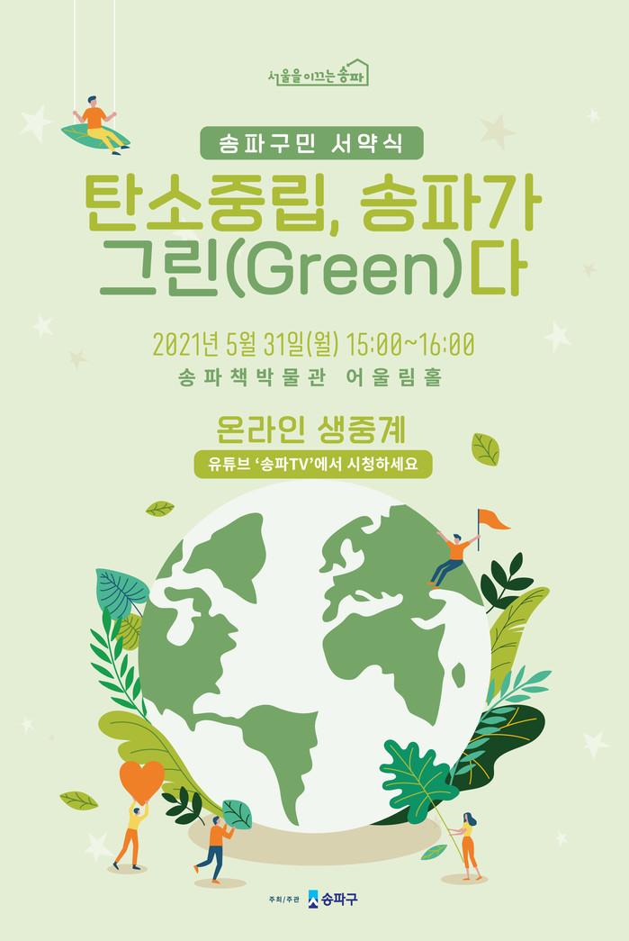 [시민일보 = 이대우 기자] 서울 송파구(구청장 박성수)가 오는 31일 오후 3시 송파책박물관 어울림 홀에서, 자치구 최초로 구민에게 탄소중립을 약속하는 송파구민 서약식 '탄소중립, 송파가 그린(Green)다' 행사를 개최한다.
