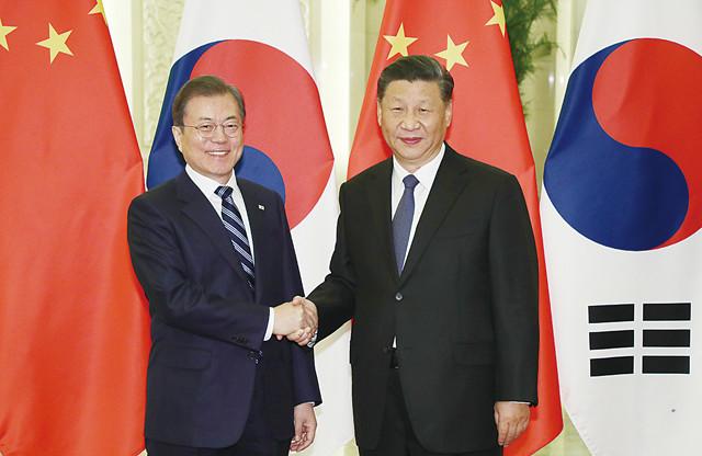 대통령과 시진핑 중국 국가주석이 23 베이징 인민대회당에서 정상회담 악수하고 있다.