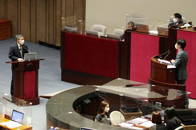 정경두 국방부 장관이 15일 국회 본회의장에서 열린 외교·통일·안보 분야 대정부 질문에서국민의힘 하태경 의원의 질문에 답변하고 있다.