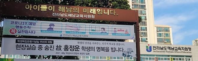 해남학생연합회는 최근 여수에서 발생한 故 홍정운 학생의 사고가 갖는 교육적 시사점이 매우 크나, 쉽게 잊혀지는 것을 안타까워하며 故 홍정운 학생 추모의 현수막을 걸며 무엇보다 학생의 안전을 우선에 두는 교육을 해줄 것을 강력히 요구했다.