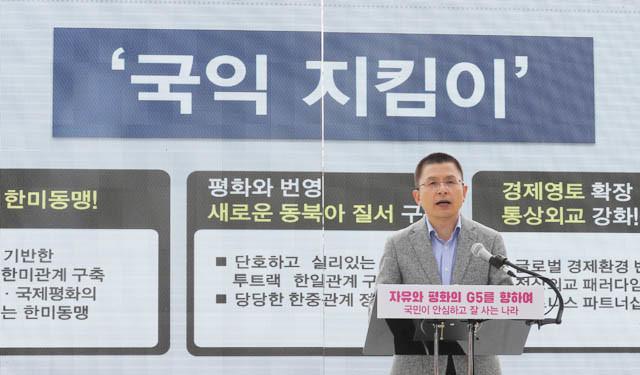 황교안 대표가 24 국회 본관 앞에서 열린 자유한국당 외교안보 정책비전 발표 ‘자유와 평화의 G5 향하여’에서 대형 화면 앞에서 발언하고 있다.