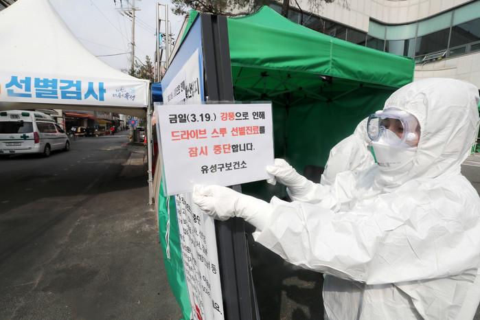 전국 곳곳에 강풍특보가 내려진 19일 오전 대전시 유성구 드라이브스루 선별진료소 앞에 강풍으로 인한 운영 일시 중단을 알리는 안내문이 붙어있다.