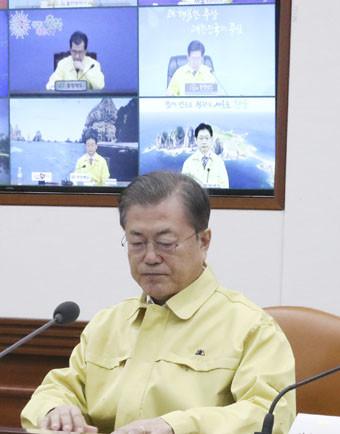 이시종 충북도지사(화면 위 오른쪽 두번째)와 양승조 충남도지사(화면 위 오른쪽)가 30일 오전 정부서울청사에서 열린 신종 코로나바이러스 감염증 대응 종합 점검회의에 참석해 있다.