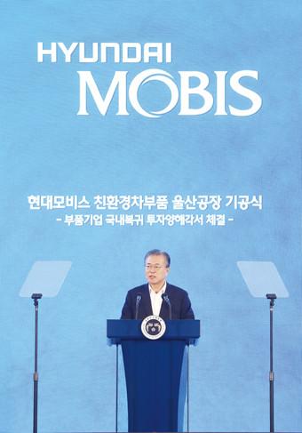 대통령이 28 오전 울산 이화산업단지에서 열린 현대모비스 친환경차 부품 울산공장 기공식에서 인사말을 하고 있다.