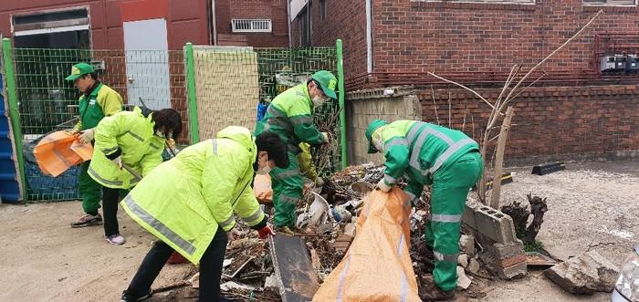 경기 수원시 팔달구 고등동은 최근 고등로71번길 일원에 수년간 방치된 쓰레기 더미를 직원과 환경관리원 10여명이 합동으로 정비에 나섰다. 사진은 관계자들이 쓰레기를 치우고 있는 모습.(사진제공=팔달구청)