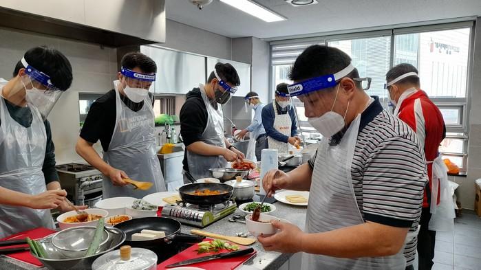인천 계양구 계산3동 주민자치회가 최근 2021년 주민주도사업 요섹남 인생나드리사업의 일환으로 추진되는 '중장년남성 요리교실'을 운영했다. 이날 요리교실에서는 취나물솥밥&양념장, 두부쭈삼볶음 요리를 실습했다. 사진은 이날 참석한 남성들이 요리 실습을 하고 있는 모습. (사진제공=계양구청)