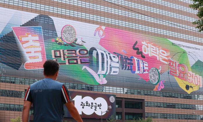 30일 오전 서울 종로구 세종대로 교보빌딩 외벽에 100번째 광화문 글판이 게시돼 있다. 100번째 광화문 글판은 BTS의 노래 '퍼미션 투 댄스'의 '[춤]만큼은 마음 가는 대로, 허락은 필요 없어'라는 노랫말을 인용했다. 디자인에는 미디어 아티스트인 이예승 작가가 참여했다.