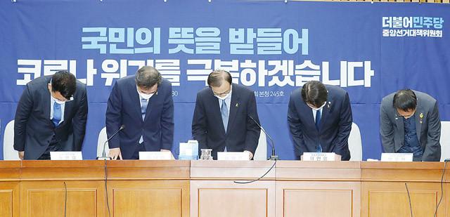 더불어민주당 이낙연-이해찬 상임선대위원장과 이인영 공동선대위원장 등이 16일 오전 서울 여의도 국회에서 열린 대한민국미래준비선거대책위원회의에서 국민에게 감사인사를 하고 있다. 이해찬 이날 4.15 총선에서 압승한 것과 관련, “이제 21대 국회는 이전과는 전혀 다른 국회, 일하는 국회, 국회다운 국회, 국민을 통합하는 국회를 만들 책임이 온전히 민주당에 있음을 마음 속에 새긴다”고 말했다.