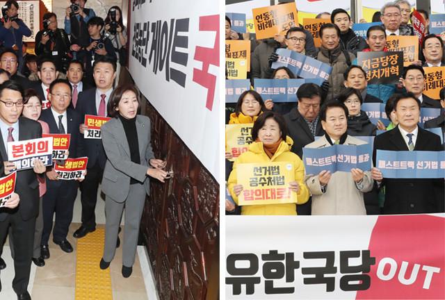 나경원 원내대표가 3 국회 로텐더홀에서 비상의원총회를 마친 본회의장 문고리를 잡고 의원들과 함께 민생법안 처리, 필리버스터 보장과 본회의 개의를 요구하고 있다(왼쪽). 바른미래당, 정의당, 민주평화당과 정치개혁공동행동의 ‘개혁발목잡는 자유한국당 규탄 선거제도 개혁완수결의’ 기자회견이 3 오후 국회 본청앞에서 열리고 있다.