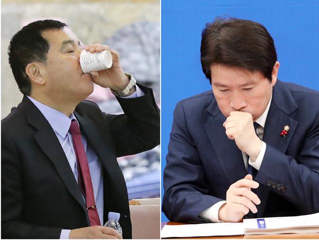 심재철 원내대표(왼쪽) 26 오전 서울 여의도 국회에서 열린 최고위원회의에서 물을 마시고 있다. 30 열린 더불어민주당 정책조정회의에서 이인영 원내대표가 발언을 마친 잠시 생각에 잠겨 있다.