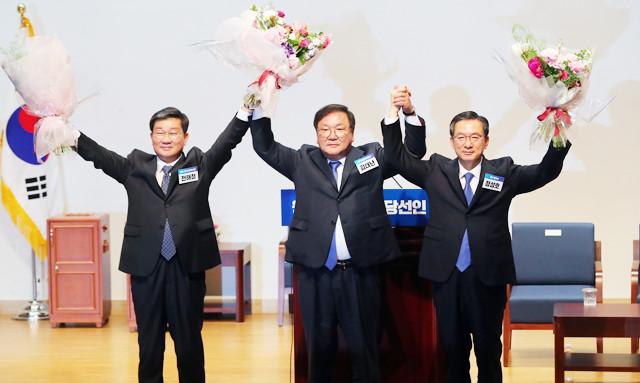 7일 국회 의원회관 대회의실에서 열린 제21대 국회 더불어민주당 제1기 원내대표 선출 당선인 총회에서 원내대표로 당선된 김태년 후보(가운데)가 기념촬영을 하고 있다. 왼쪽부터 전해철, 김태년, 정성호.