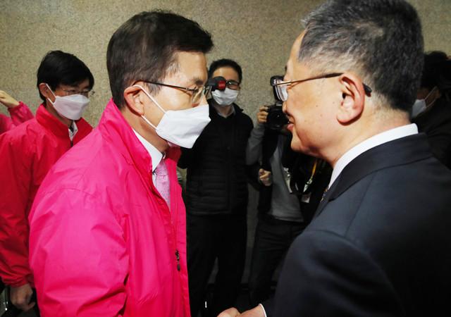 미래통합당 황교안 대표(왼쪽)가 19일 국회에서 최고위원회의에 참석하려던 중 비례대표 등에 대한 공천 재심의 요구를 하는 김재경 의원과 대화하고 있다.