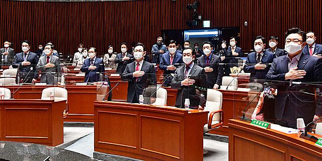 국민의힘 주호영 원내대표와 의원들이 19일 국회에서 열린 의원총회에서 국기에 대한 경례를 하고 있다.