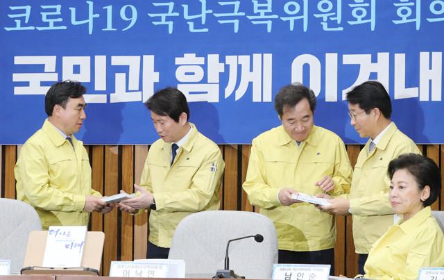 23일 오전 서울 여의도 국회에서 열린 더불어민주당 코로나19국난극복위원회에서 이낙연 국난극복위원장과 이인영 원내대표가 정책집을 전달받고 있다.