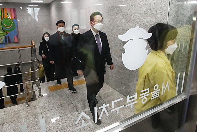 국민의힘 주호영 원내대표가 6일 오전 신종 코로나바이러스 감염증(코로나19) 집단 감염이 발생한 서울 동부구치소를 방문하고 있다.