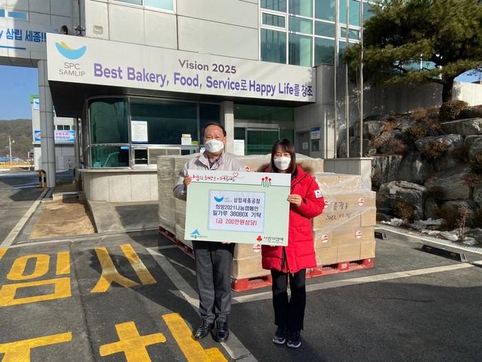 | ▲ SPC삼립 세종공장 한창남 센터장(좌), 세종사회복지공동모금회 김은영 팀장(우)이 함께 전달식을 진행한 모습 |