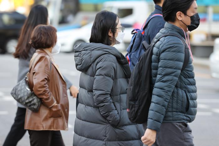 쌀쌀한 아침 날씨를 보인 2일 오전 서울 종로구 광화문네거리에서 시민들이 발걸음을 재촉하고 있다.