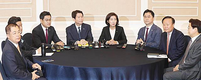 이만희 의원(왼쪽부터), 바른미래당 유의동 의원, 오신환 원내대표, 더불어민주당 이인영 원내대표, 자유한국당 나경원 원내대표, 더불어민주당 김종민 의원, 자유한국당 김재원 의원, 더불어민주당 박찬대 의원이 23 오후 국회 귀빈식당에서 열린 선거제 개혁안 논의 3+3 회동에서 포즈를 취하고 있다.