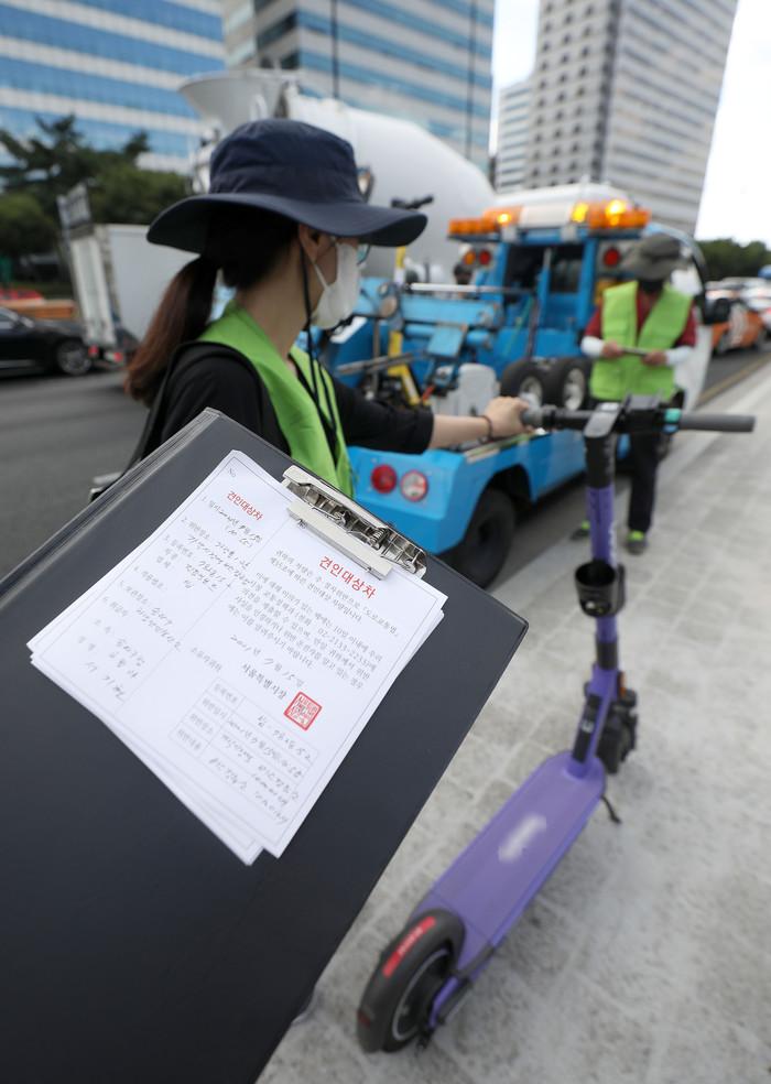 15일 오전 서울 송파구 가락시장역 인근에서 송파구청 관계자가 불법 주정차된 전동 킥보드를 견인하고 있다. 서울시는 이날부터 6개 자치구(성동·송파·도봉·마포· 영등포·동작) 내 불법 주·정차 공유 전동킥보드를 견인한다.
