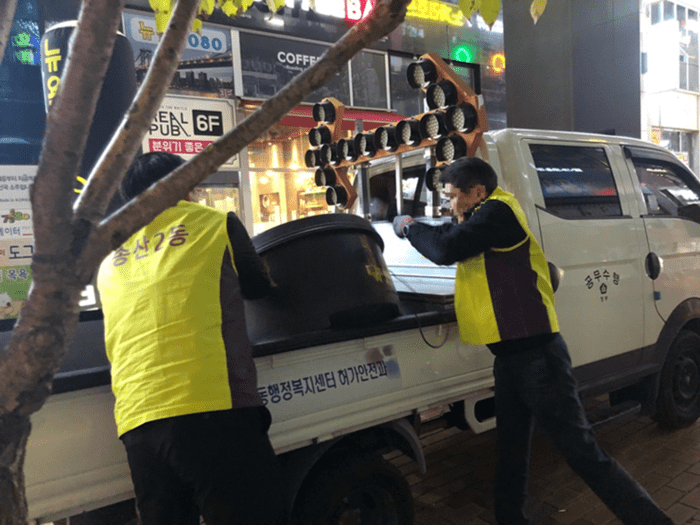 경기 의정부시 송산2동 행정복지센터는 최근 민락동 로데오거리, 금오동 홈플러스 상가 지역 일대를 대상으로 불법유동광고물(에어라이트, 입간판, 베너 등)에 대한 야간 특별단속을 실시했다. 사진은 불법유동광고물을 수거하고 있는 모습.(사진제공=의정부시청)