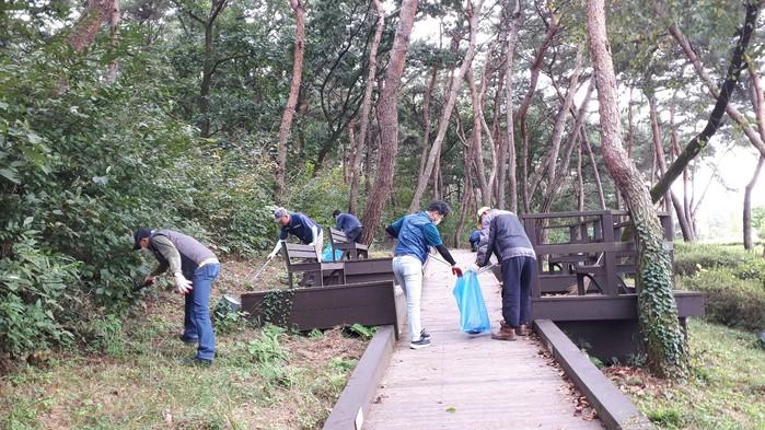 경기 여주시는 지난 23일 추석명절을 맞이해 '추석맞이 공원녹지 및 산림휴양시설 대청소'를 실시했다. 시설내 방치된 쓰레기를 수거하고 산책로에 떨어진 낙엽 등을 수거·정리하고 편의시설물 안전점검도 실시했다. 사진은 이날 참여자들이 산림욕장에서 쓰레기를 줍고 있는 모습.(사진제공=여주시청)