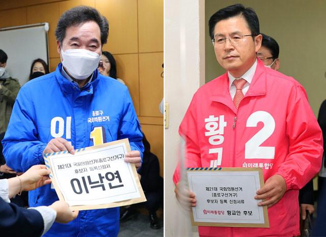 제21대 총선에서 서울 종로구에 출마하는 더불어민주당 이낙연 후보(사진 왼쪽)와 미래통합당 황교안 후보가 26일 오전 종로구선거관리위원회에서 후보 등록을 하고 있다.