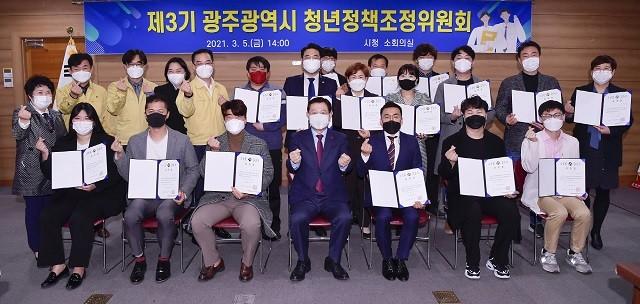 [광주=정찬남 기자] 이용섭 광주광역시장이 5일 오후 시청 소회의실에서 열린 제3기 청년정책조정위원회 위원들에게 위촉장을 수여한 뒤 기념촬영을 하고 있다./광주광역시 제공
