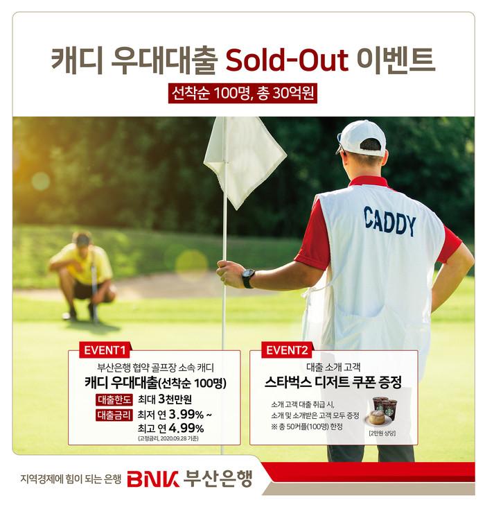 [시민일보 = 여영준 기자] BNK부산은행은 28일부터 오는 12월말까지 협약이 체결된 골프장 소속 캐디를 대상으로 ‘캐디 우대대출 SOLD-OUT 이벤트’를 실시한다.