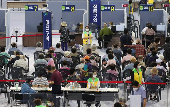8일 대구 수성구 육상진흥센터에 설치된 수성구 코로나19 예방접종센터에서 시민들이 백신접종을 하고 있다.
