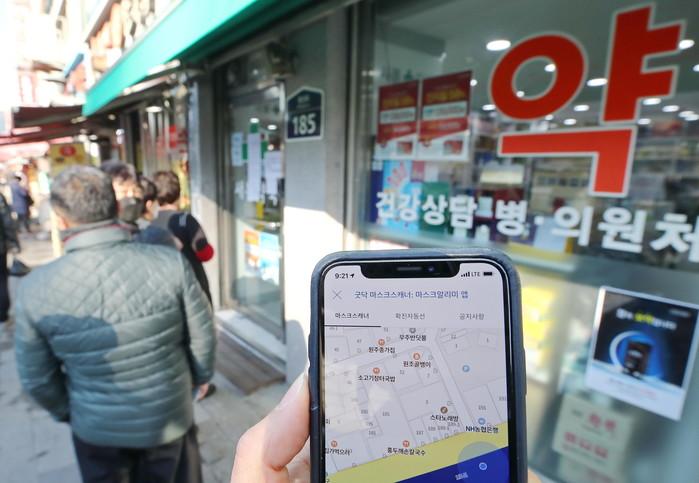 공적 마스크 판매처와 수량 등을 실시간으로 알려주는 애플리케이션(앱)과 웹 서비스가 시작된 11일 오전 서울 시내 한 약국에 마스크 재고가 충분해 시민들이 줄을 서 구매하고 있지만, 휴대전화의 마스크 앱에는 약국의 위치가 표시되어 있지 않다.