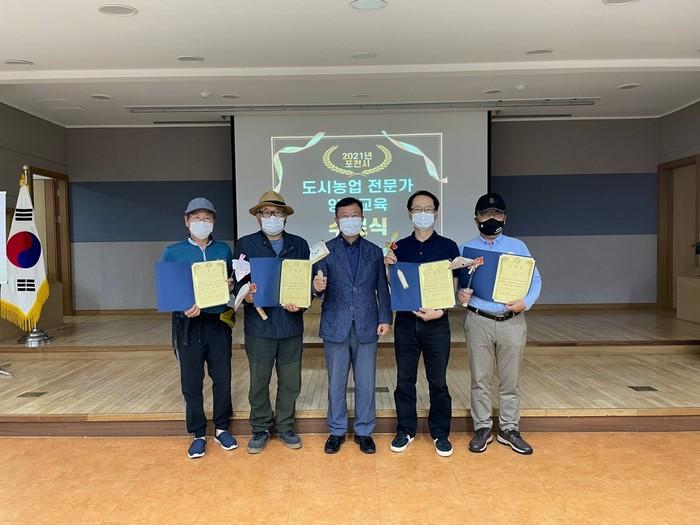 경기 포천시농업기술센터는 최근 도시농업 전문인력을 양성하기 위해 추진한 ‘2021년 도시농업전문가 양성교육’ 수료식을 개최했다. 교육을 수료하면 농림축산식품부가 발급하는 ‘도시농업관리사’ 국가자격증 취득요건 중 하나를 충족하게 된다. 사진은 수료식에서 수료생들이 기념촬영을 하는 모습. (사진제공=포천시청)