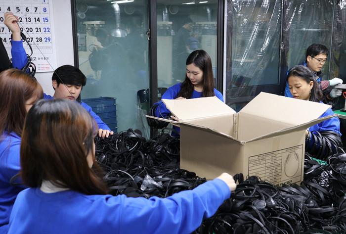 ▲ 해바라기 봉사단원들이 헤드셋을 분류하는 모습. (사진제공=bhc치킨) |